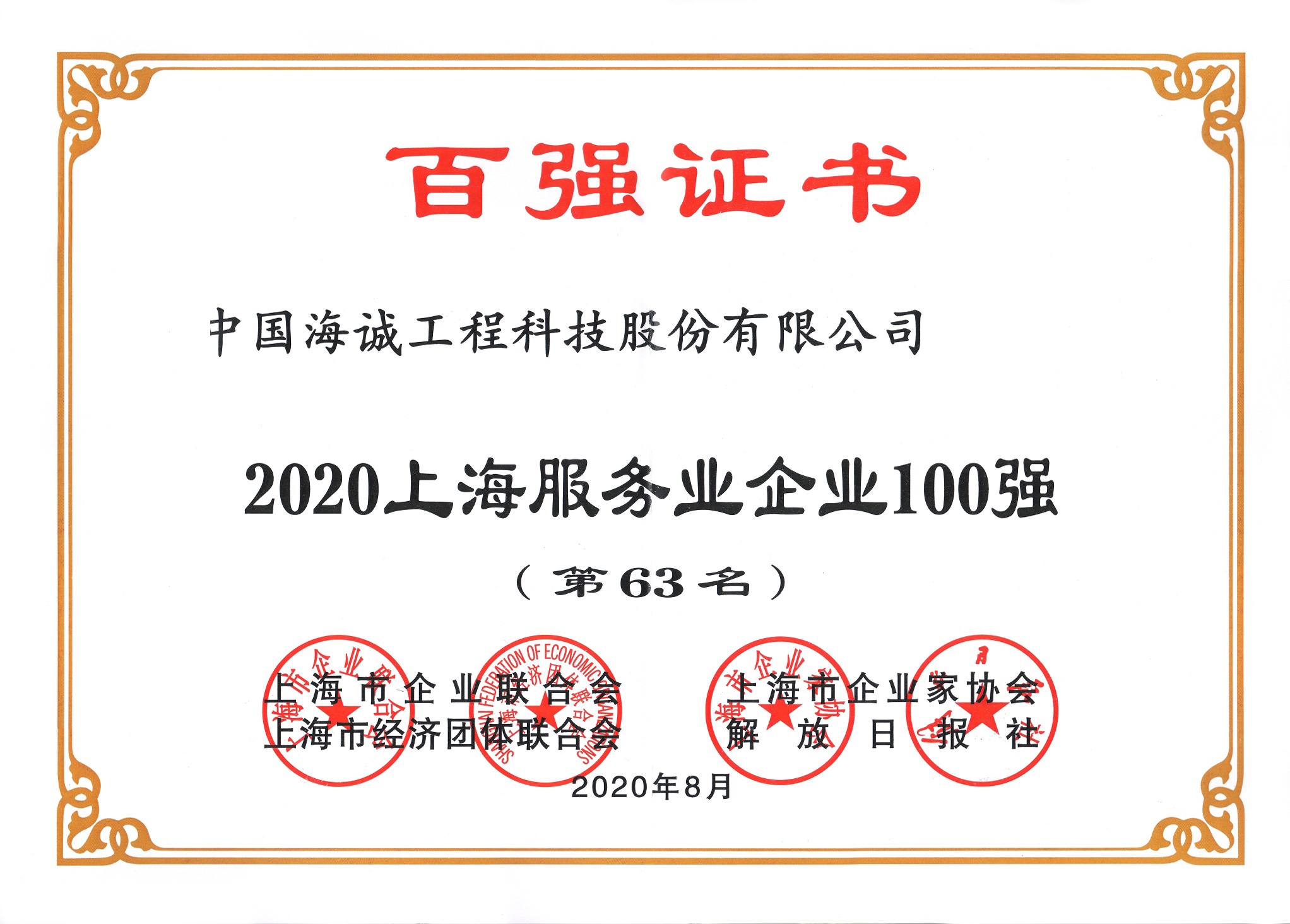 On August 18, the "Top Hundred Enterprises of Shanghai 2020 Press Release" was held in Shanghai jointly by Shanghai Enterprise Federation, Shanghai Entrepreneurs Association, Shanghai Federation of Economic Organizations and Jiefang Daily. The event announced the "Top Hundred Service Industry Enterprises of Shanghai" along with other rankings. Haisum was once again honored as one of the "Top Hundred Service Industry Enterprises of Shanghai," this time placed at 63rd.