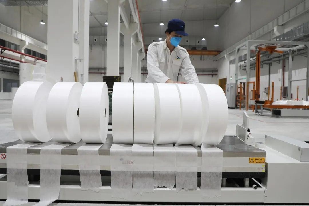 項目引進(jìn)美國進(jìn)口孖紡生產(chǎn)線,生產(chǎn)50~200gsm克重產(chǎn)品,運行車速為250m/min,年生產(chǎn)能力為8000~9000噸,是亞洲第一條孖紡高分子吸附新材料生產(chǎn)線。生產(chǎn)的孖紡產(chǎn)品可廣泛應(yīng)用于口罩、防護(hù)服、手術(shù)墊、護(hù)理墊、洞巾等醫(yī)療防護(hù)用品的過濾芯層,以及高檔濕巾、隔音隔熱材料等領(lǐng)域。