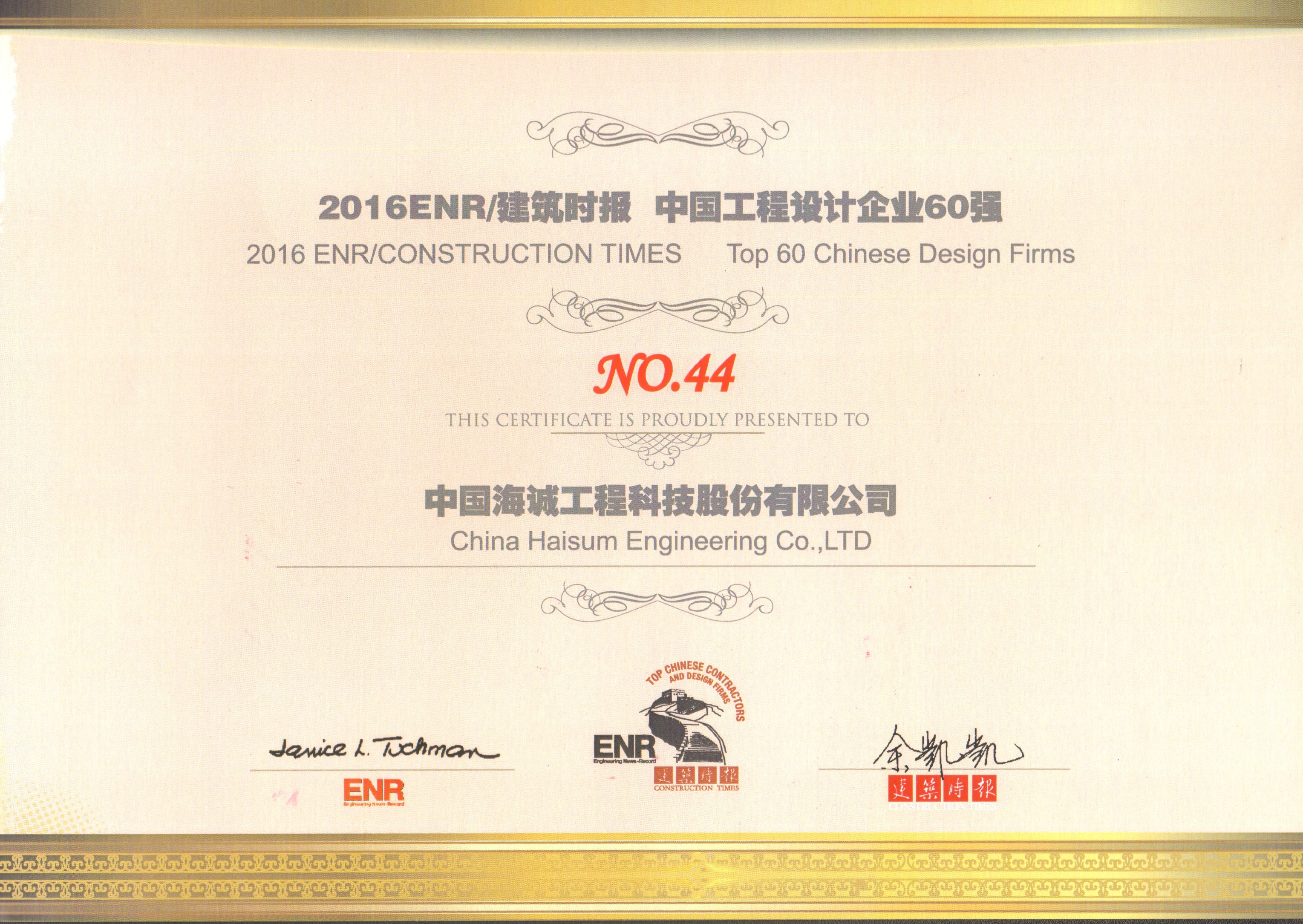 2016年ENR/《建筑時(shí)報(bào)》“中國(guó)承包商80強(qiáng)和工程設(shè)計(jì)企業(yè)60強(qiáng)”頒獎(jiǎng)典禮于2016年11月24日-25日在福州隆重舉行。海誠(chéng)股份以設(shè)計(jì)營(yíng)業(yè)收入103931.84萬(wàn)元位列中國(guó)工程設(shè)計(jì)企業(yè)60強(qiáng)第44位。
