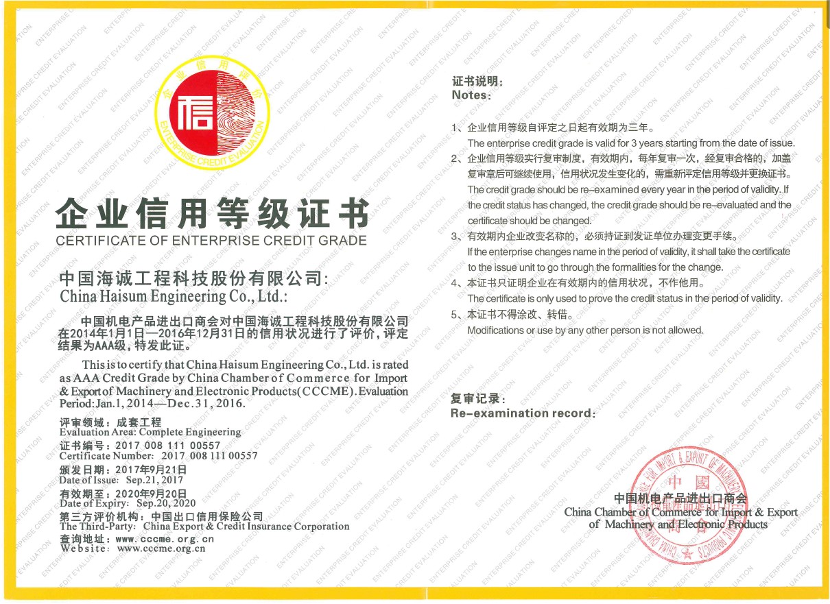 中國機電產品進出口商會由國資委批準成立,是全國首批信用評價試點單位,是我國從事機電產品進出口貿易相關活動的全國性行業組織。中國海誠股份自參加成套工程領域信用評價以來,連續獲得成套工程領域AAA級信用企業稱號。
