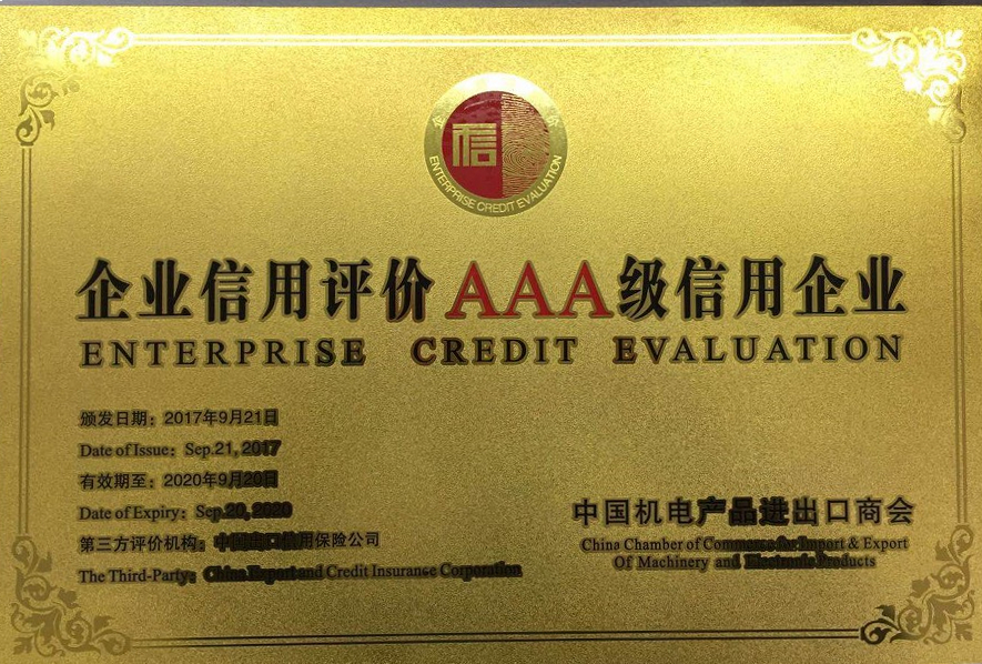 近日,中國機電產品進出口商會公布了2017年機電行業信用評價企業名錄,我司再次榮獲“成套工程領域AAA級(最高級別)信用企業稱號”。