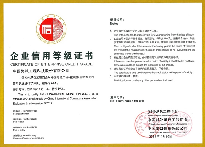 近日,在中國對外承包工程商會和中國出口信用保險公司聯合舉辦的2017年度對外承包工程企業信用等級評價中,公司又一次獲得“aaa級信用企業”稱號。