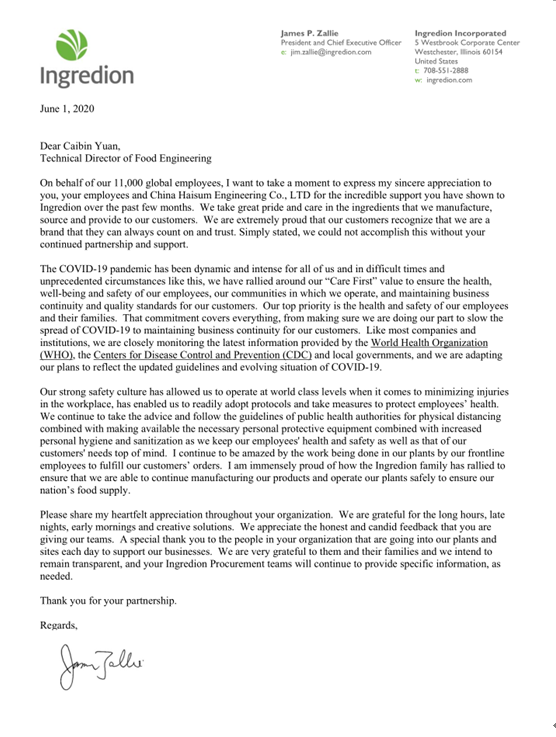 日前,海誠股份食品總監(jiān)袁蔡斌收到一封來自美國宜瑞安集團(Inredion Incorporated)首席執(zhí)行官詹姆斯•扎利(James Zallie)先生的感謝信,信中對公司的宜瑞安五星項目設(shè)計團隊以及項目經(jīng)理黃萍,在新冠疫情期間為項目順利進行所付出的辛勤工作表示感謝。