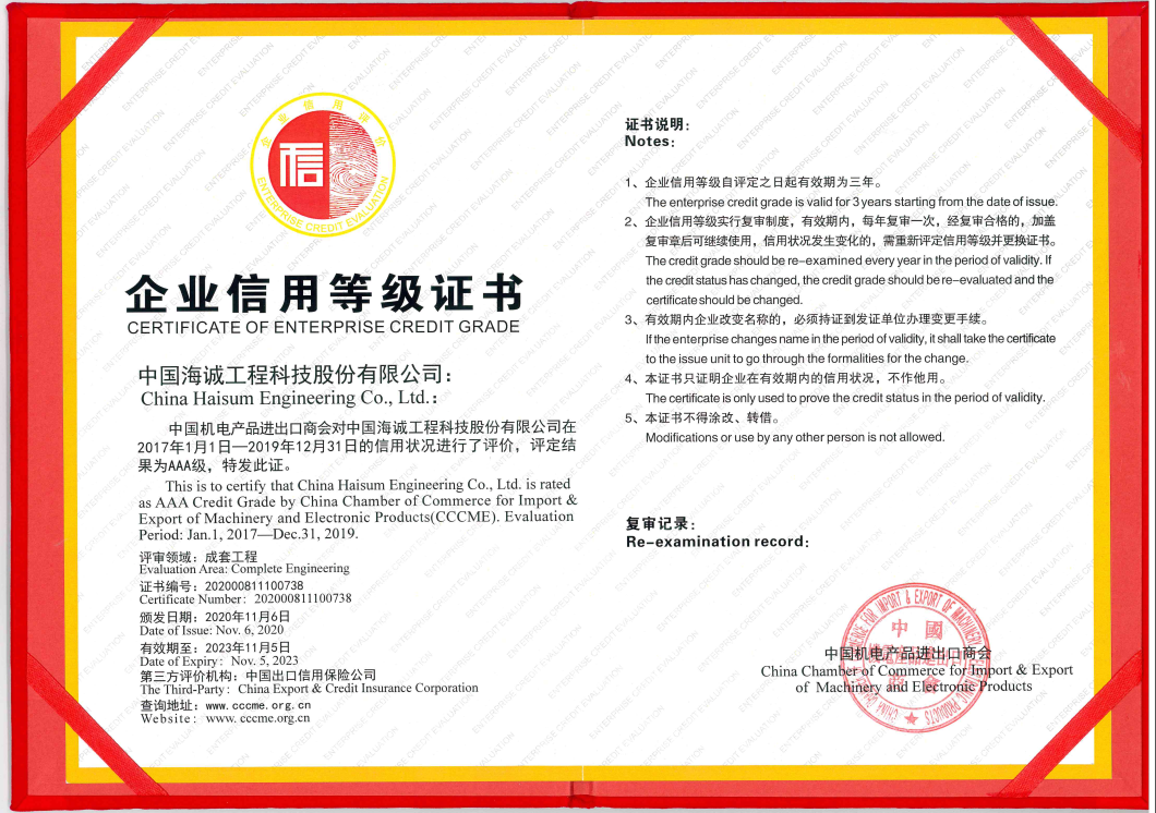 中國(guó)機(jī)電產(chǎn)品進(jìn)出口商會(huì)作為我國(guó)機(jī)電產(chǎn)品進(jìn)出口行業(yè)唯一的全國(guó)性商會(huì),現(xiàn)有會(huì)員企業(yè)近萬(wàn)家,具有較強(qiáng)的行業(yè)代表性。企業(yè)信用等級(jí)評(píng)價(jià)由商務(wù)部、國(guó)資委牽頭,中國(guó)出口信用保險(xiǎn)公司作為第三方評(píng)審機(jī)構(gòu),中國(guó)機(jī)電產(chǎn)品進(jìn)出口商會(huì)進(jìn)行復(fù)審。公司自2008年起參加中國(guó)機(jī)電產(chǎn)品進(jìn)出口商會(huì)企業(yè)信用等級(jí)評(píng)價(jià)以來(lái),已連續(xù)多年獲得AAA級(jí)信用企業(yè)稱號(hào)。獲得該榮譽(yù),代表公司在成套工程領(lǐng)域有極高的信用管理水平,為公司更好地“走出去”參與國(guó)際合作與競(jìng)爭(zhēng)發(fā)揮信用支撐作用。