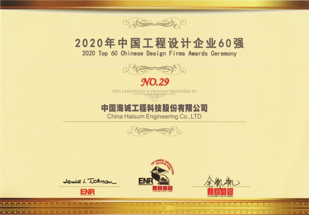 日前,“2020ENR/建筑時報中國承包商80強和工程設計企業(yè)60強”榜單揭曉,海誠股份再次上榜,榮膺“2020中國工程設計企業(yè)60強”位列第29位。