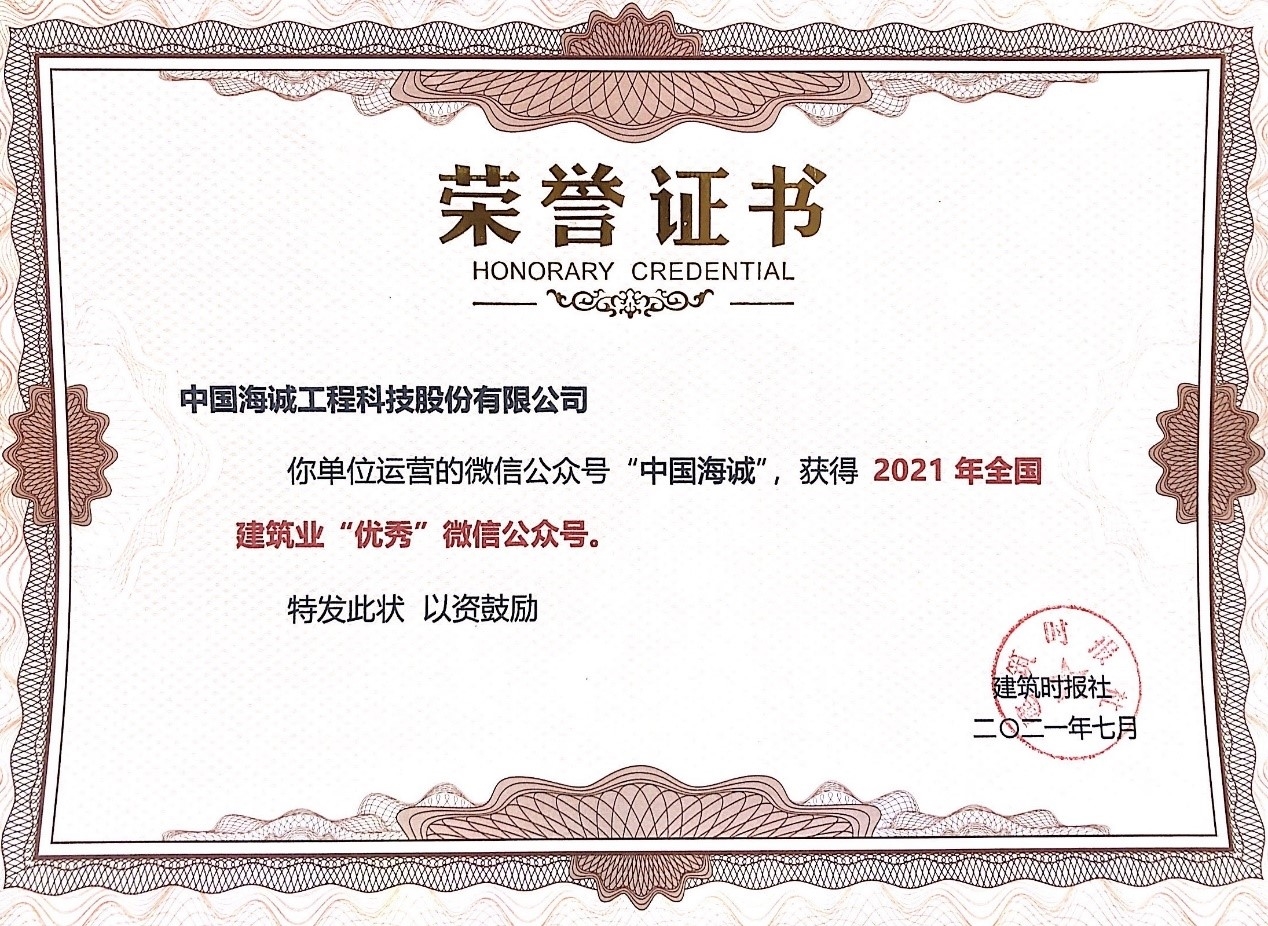 7月16日,由建筑時報社主辦的2021建筑業微信公眾號運維經驗交流研討會暨全國建筑業優秀公眾號頒獎典禮在揚州召開。中國海誠官方微信公眾號榮獲“2021年全國建筑業優秀微信公眾號”。這是公司繼去年獲獎后連續兩年獲此殊榮。