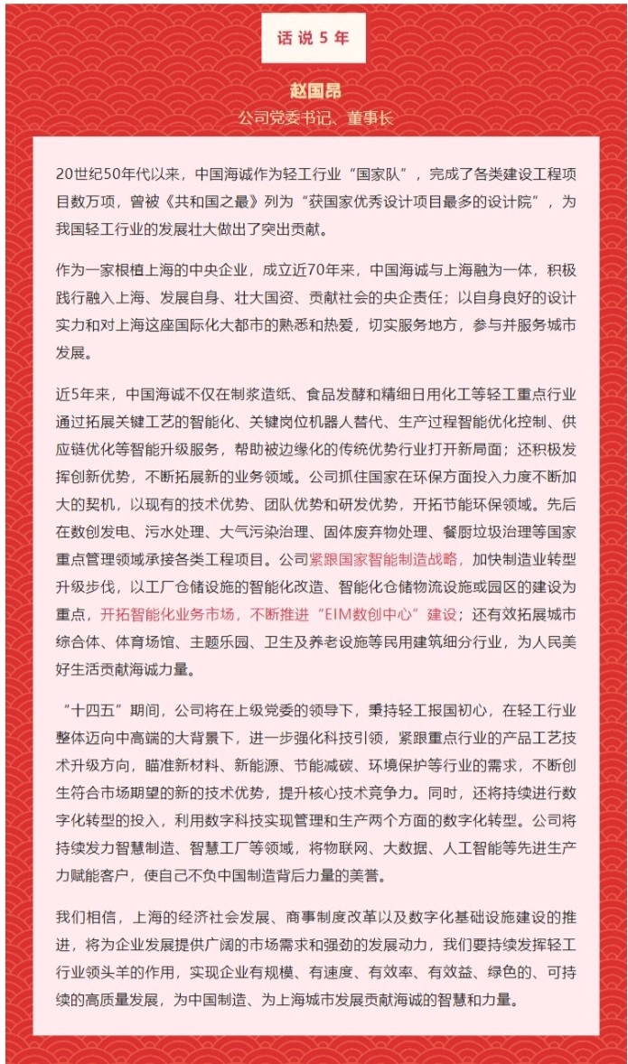近年來,中國海誠積極倡導產(chǎn)學研合作,開展技術創(chuàng)新。產(chǎn)學研合作成果已在多個項目的成套設備和工程體系中運用,加速了中國海誠科技能力的提升,也加快了市場開拓的步伐。“作為從事輕工行業(yè)專業(yè)服務的在滬央企,中國海誠將繼續(xù)堅持在黨的領導下,肩負起全新的歷史使命,把握國際國內發(fā)展大勢,立足公司現(xiàn)實,用組織變革、技術提升和數(shù)字化轉型跨越鴻溝,用創(chuàng)新進取、服務客戶、精益管理、優(yōu)秀執(zhí)行來應對不確定性,通過數(shù)字化轉型,站在更廣義的產(chǎn)業(yè)鏈上,再定位、再出發(fā),用數(shù)字技術和集成創(chuàng)新點亮海誠未來,以優(yōu)異的成績向黨的二十大獻禮!”中國海誠黨委書記、董事長趙國昂說。