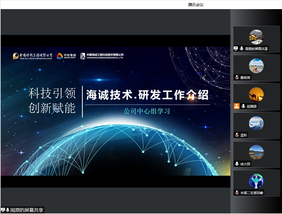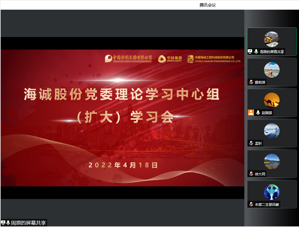2022年4月18日下午,海誠股份黨委以視頻會議形式,召開2022年度第一次理論中心組(擴大)學習會。會議主題是“科技引領、創新賦能”。會議由公司黨委書記、董事長趙國昂主持,公司領導班子成員、總部職能部門負責人、各直屬黨支部書記、技術研發中心員工等31人參加了學習。