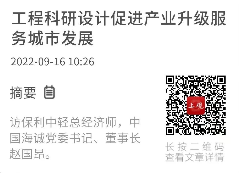 《工程科研設(shè)計(jì)促進(jìn)產(chǎn)業(yè)升級(jí)服務(wù)城市發(fā)展——訪保利中輕總經(jīng)濟(jì)師,中國海誠黨委書記、董事長趙國昂》
