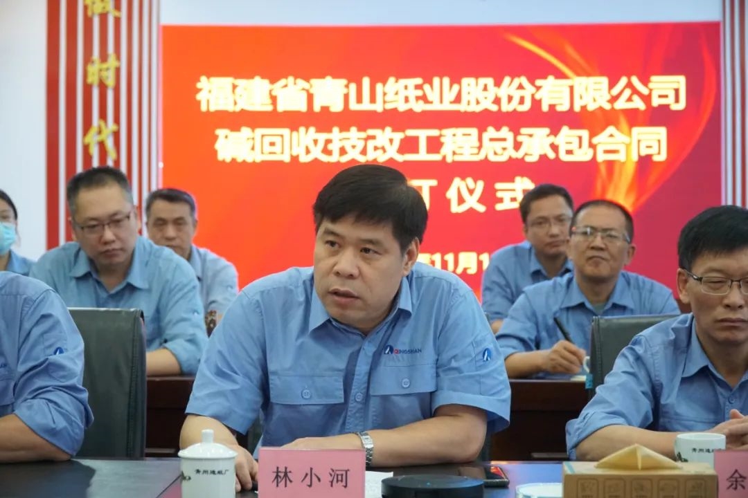 儀式現場,福建省青山紙業股份有限公司黨委書記、總經理林小河與中國海誠長沙公司總經理助理、制漿造紙事業部總經理張成峰簽訂總承包合同。該項目的成功實施將有效解決青山紙業現有生產系統所存在的漿堿紙能力不平衡等問題,有利于生產裝備技術水平的整體提高,降本增效、節能降耗、減排治污,實現企業綠色循環持續發展。