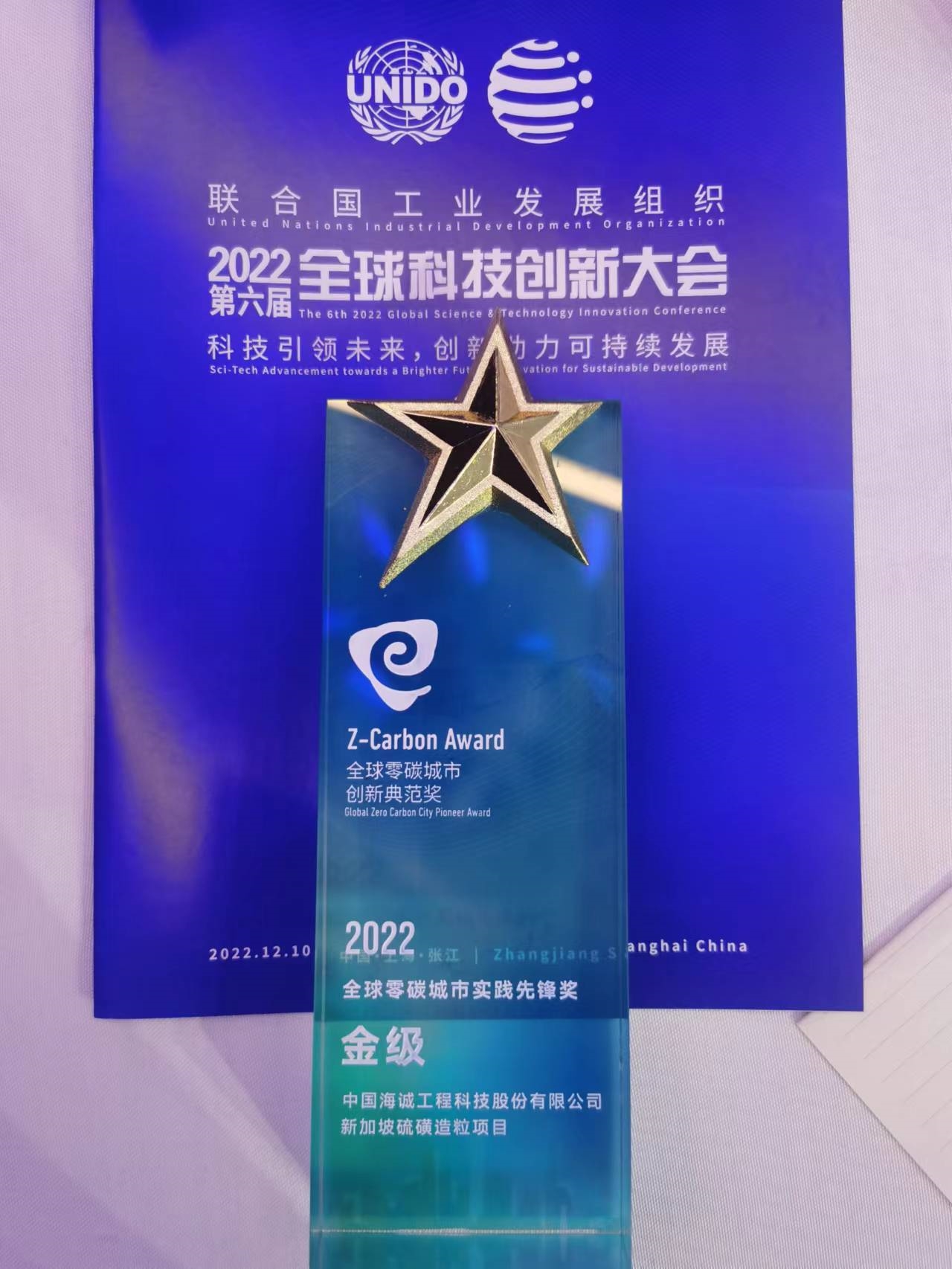 2022年12月10日,2022第六屆聯(lián)合國(guó)工業(yè)發(fā)展組織全球科技創(chuàng)新大會(huì)在上海成功舉辦。會(huì)上,中國(guó)海誠(chéng)獲“全球零碳城市創(chuàng)新典范獎(jiǎng)”殊榮,由中國(guó)海誠(chéng)總承包的“新加坡硫磺造粒項(xiàng)目”榮獲“2022全球零碳城市實(shí)踐先鋒獎(jiǎng)金級(jí)”。