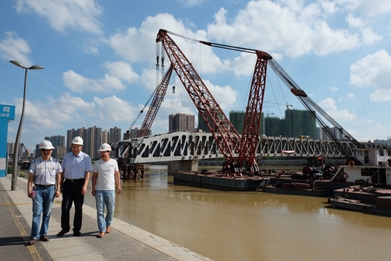 同一時間,瀏陽河人行景觀橋項目部已經(jīng)完成了最后一艘浮吊平臺的錨固工作。最初臨時橋墩施工方案為每組8根鋼管樁,監(jiān)理部審核認為該方案未考慮最不利的極端天氣下洪峰的影響,嚴令改正。最終方案改為14根鋼管樁并予以實施。正是監(jiān)理人富于遠見的及時調(diào)整,在兩日后瀏陽河水位達40.00米的洪峰里,建設(shè)中的大橋巍然屹立,風雨不動!