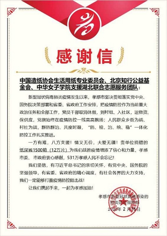 災(zāi)難無(wú)情,行業(yè)有愛!中國(guó)制漿造紙研究院有限公司、中國(guó)造紙協(xié)會(huì)生活用紙專業(yè)委員會(huì)以及衛(wèi)品行業(yè)的企業(yè)家和科技工作者用實(shí)際行動(dòng)踐行社會(huì)責(zé)任,齊心協(xié)力馳援湖北、共克時(shí)艱,為打贏這場(chǎng)疫情防控阻擊戰(zhàn)貢獻(xiàn)力量。