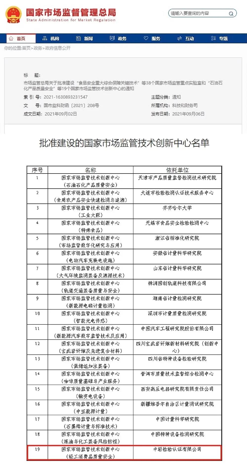 近日,保利中輕所屬中輕檢驗認證有限公司聯(lián)合中國食品發(fā)酵工業(yè)研究院有限公司、中國日用化學研究院有限公司、中國制漿造紙研究院有限公司、中國皮革制鞋研究院有限公司共同組織申報的“國家市場監(jiān)管技術(shù)創(chuàng)新中心(輕工消費品質(zhì)量安全)”建設(shè)項目,獲得國家市場監(jiān)督管理總局批準,成為輕工消費品領(lǐng)域唯一的綜合性的國家市場監(jiān)管技術(shù)創(chuàng)新中心。