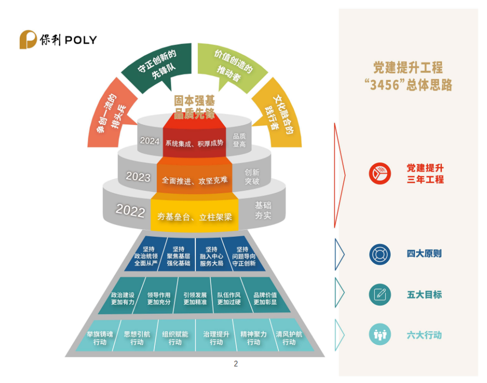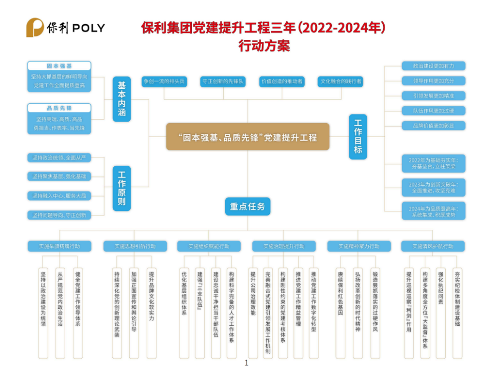 編者按:12月22日,保利集團(tuán)在京召開(kāi)學(xué)習(xí)貫徹黨的十九屆六中全會(huì)精神暨2022年度黨建工作會(huì),會(huì)上正式發(fā)布了《保利集團(tuán)“固本強(qiáng)基、品質(zhì)先鋒”黨建提升工程三年(2022-2024年)行動(dòng)方案》(以下簡(jiǎn)稱“《方案》”)。為貫徹落實(shí)《方案》,保利中輕迅速組織傳達(dá)學(xué)習(xí),并特別策劃《黨建提升 保利中輕在行動(dòng)》專題,計(jì)劃持續(xù)定期報(bào)道保利中輕貫徹落實(shí)情況,旨在帶領(lǐng)全體干部員工一同認(rèn)真學(xué)習(xí)、深刻領(lǐng)會(huì),切實(shí)落實(shí)《方案》要求,突出抓基層強(qiáng)基礎(chǔ),推動(dòng)黨建工作提質(zhì)增效、邁上新臺(tái)階,以高質(zhì)量黨建引領(lǐng)保障保利中輕高質(zhì)量發(fā)展,為保利集團(tuán)建設(shè)世界一流,追求卓越,貢獻(xiàn)中輕力量。今天第一期,一起來(lái)學(xué)《方案》的主要內(nèi)容。