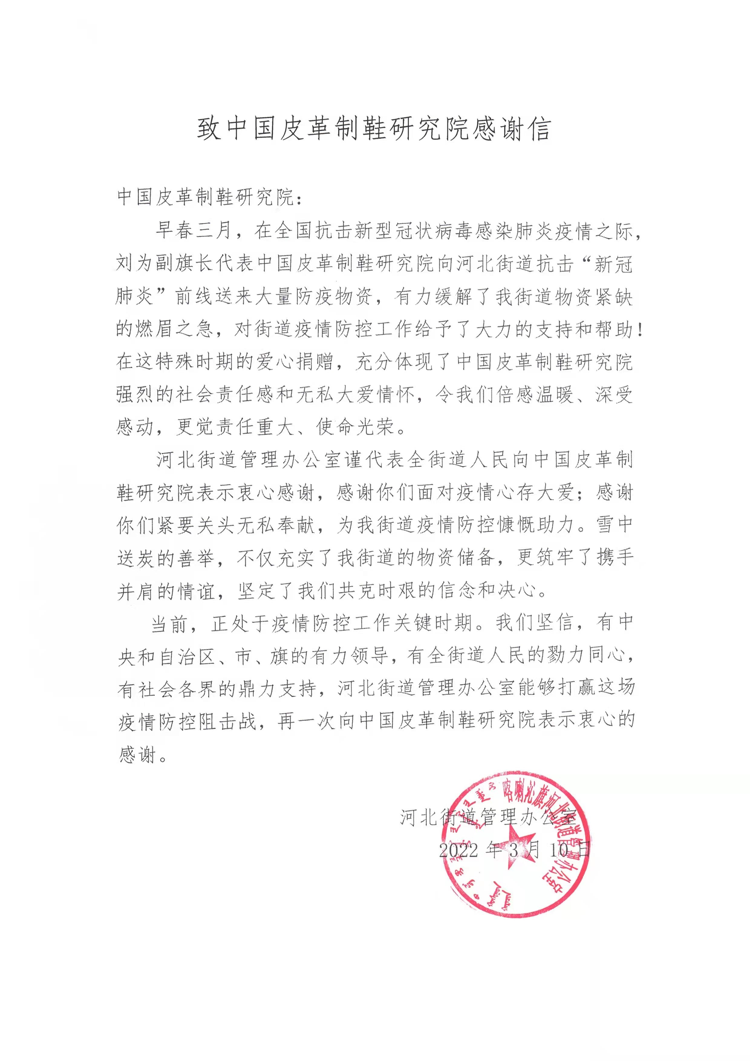 為助力內(nèi)蒙古喀喇沁旗渡過疫情難關(guān),中國皮革制鞋研究院向喀喇沁旗河北街道捐贈了400套防護服,并收到河北街道發(fā)來的感謝信。