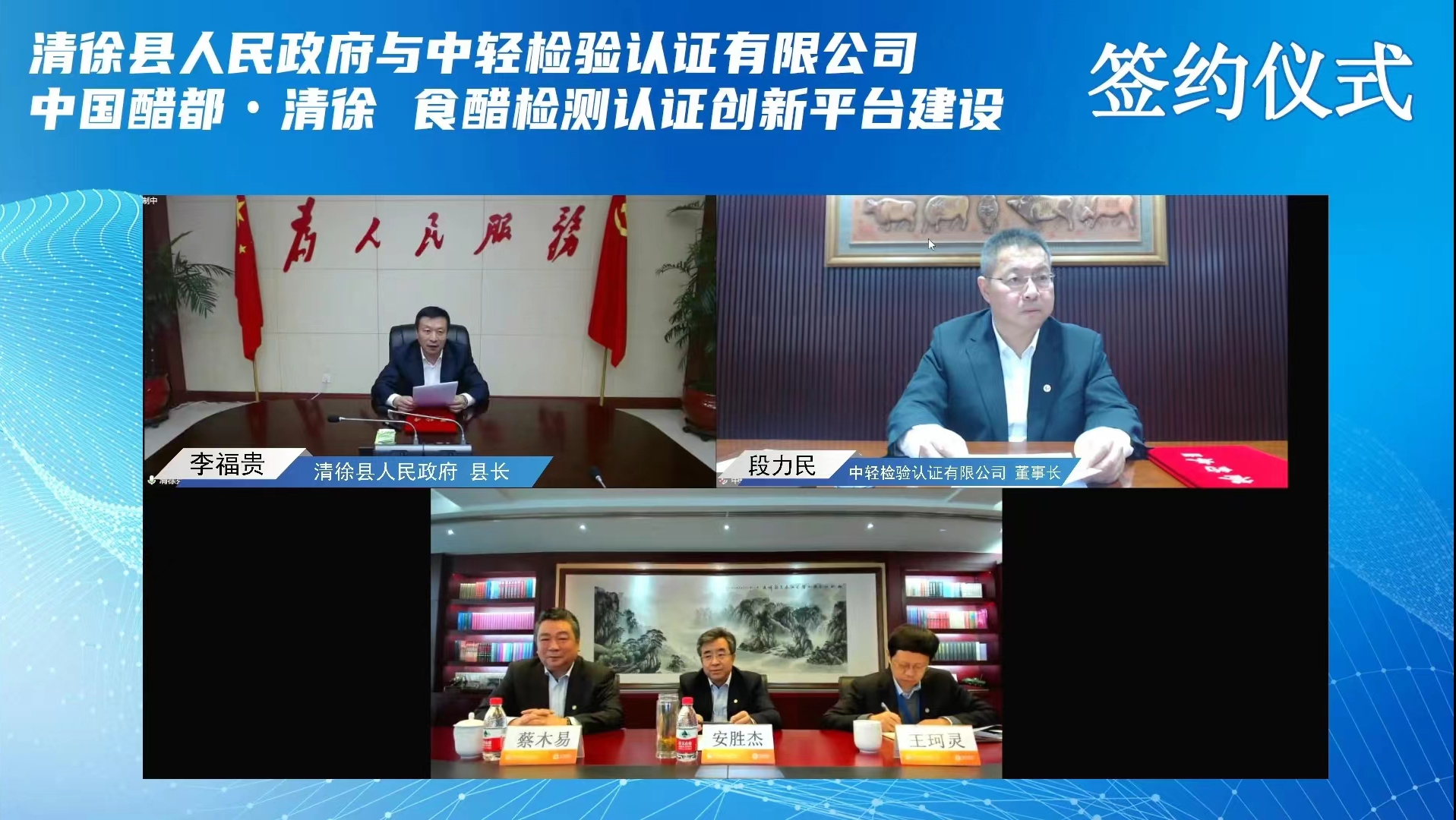 為進一步落實習近平總書記在黨的二十大報告中提出的“必須堅持科技是第一生產力、人才是第一資源、創(chuàng)新是第一動力,深入實施科教興國戰(zhàn)略、人才強國戰(zhàn)略、創(chuàng)新驅動發(fā)展戰(zhàn)略,開辟發(fā)展新領域新賽道,不斷塑造發(fā)展新動能新優(yōu)勢。” 11月11日,保利中輕所屬中輕檢驗與山西省太原市清徐縣人民政府以線上“云簽約”形式舉行食醋檢測認證創(chuàng)新平臺合作項目簽約儀式。保利集團總經理助理,保利中輕黨委書記、董事長安勝杰;保利中輕黨委副書記、總經理王珂靈,副總經理蔡木易出席簽約儀式。