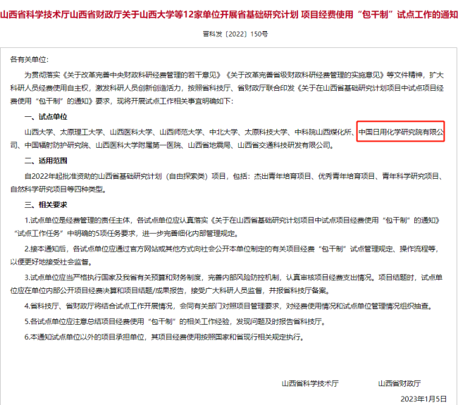 中國日用化學研究院獲批成為山西省基礎研究計劃項目經費使用“包干制”試點單位 。中國日用化學研究院將以此為契機,加大科研投入,激發科研人員創造活力,不斷提升創新能力。