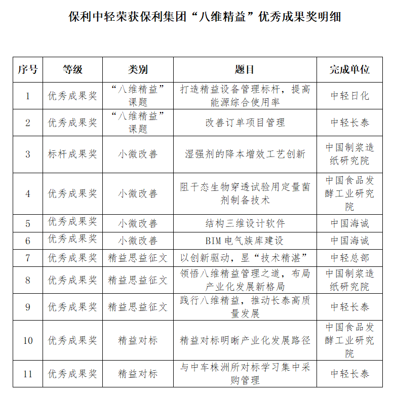 會議期間,舉行了“八維精益”優秀成果頒獎典禮。保利集團從2022年“八維精益”各項工作成果中評選出83項優秀成果獎,其中標桿成果獎6項。保利中輕榮獲標桿成果獎1項、優秀成果獎10項,其中,“濕強劑的降本增效工藝創新”課題獲得標桿成果獎。該課題團隊通過不斷優化濕強劑生產技術方案,成功研制出低成本高質量生產技術,提升了產品市場份額和競爭力,實現客戶成本降低15%。
