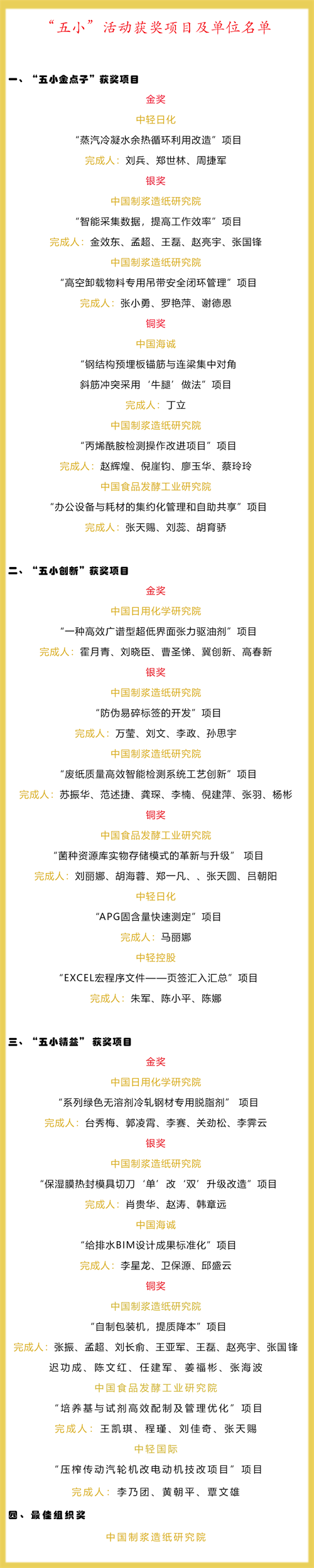 2023年,保利中輕各級(jí)工會(huì)積極組織,廣大員工踴躍參加,共征集各類創(chuàng)新成果45項(xiàng),涵蓋產(chǎn)品研發(fā)、施工工藝、精益管理等多個(gè)領(lǐng)域。保利中輕工會(huì)經(jīng)過初選和現(xiàn)場(chǎng)答辯,評(píng)選出“五小金點(diǎn)子”“五小創(chuàng)新”“五小精益”三個(gè)類別中的金獎(jiǎng)、銀獎(jiǎng)和銅獎(jiǎng)18個(gè)獎(jiǎng)項(xiàng),最佳組織獎(jiǎng)1個(gè)獎(jiǎng)項(xiàng)。