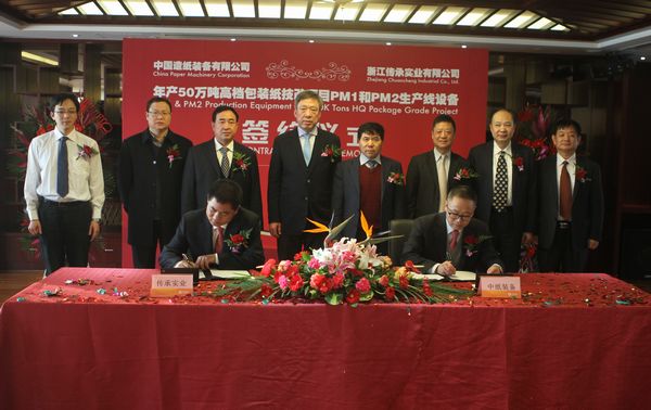 隨后,中國造紙裝備有限公司總經理周后煉先生和浙江永泰紙業集團生產總監、浙江傳承實業有限公司董事陳獻忠先生代表合作雙方在合同文本上簽字。