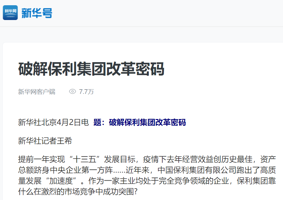3月31日,國企改革典型宣傳保利專場媒體座談會召開。會上,保利集團領導與人民日報、新華社、中央廣播電視總臺、光明日報、經(jīng)濟日報、中國日報等18家媒體單位的記者就保利集團改革發(fā)展情況進行座談。近日,新華社刊發(fā)專題文章,詳細介紹保利集團改革密碼——